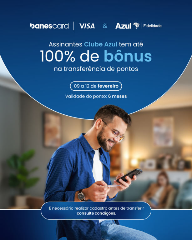 Assinantes Clube Azul com mais de cinco anos de assinatura recebem o valor máximo de 100% de bônus – Para os assinantes Clube Azul de três a quatro anos de adesão ao Clube, a bonificação aumenta em mais 20%, alcançando 90% de bônus. E os assinantes Clube Azul com mais de cinco anos de assinatura recebem o valor máximo de 100% de bônus na transferência dos pontos. O primeiro passo para os clientes do Banestes aproveitarem a parceria é estarem cadastrados no Azul Fidelidade. Depois, é necessário acessar o Programa de Fidelidade Banestes – pelo App, basta ir ao menu Cartões, depois Programa de Fidelidade e em seguida Resgatar pontos. Após essa etapa, basta acessar a aba “Milhas”, clicar em Azul, escolher a quantidade de pontos a ser transferida e finalizar a transferência. A iniciativa é uma ótima oportunidade para os clientes do banco otimizarem ainda mais o valor dos pontos acumulados a partir da utilização dos cartões de crédito da família Banescard Visa. A validade dos pontos bônus é de seis meses e o limite de bônus por CPF é de 300.000 (trezentos mil) pontos.