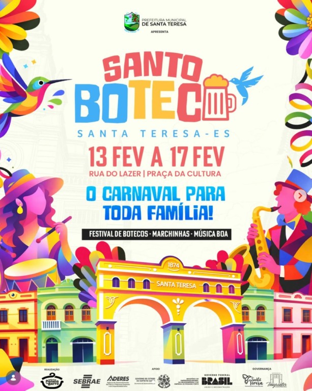 Sustentabilidade e compromisso Social – O Santo Boteco também desfila com responsabilidade ambiental. O festival mantém o uso de copos ecológicos, evitando o descarte de milhares de unidades de plástico, e realiza o recolhimento e destinação correta de todo o óleo de fritura utilizado pelos empreendimentos. “O Santo Boteco reforça Santa Teresa como um destino que vai muito além do Carnaval. O festival mostra que é possível viver a tranquilidade das montanhas sem abrir mão da alegria, da cultura e da boa gastronomia, consolidando o município como um polo turístico ativo durante todo o ano”, afirma o presidente do Instituto Panela de Barro, chef Alessandro Eller. O Festival Santo Boteco é apresentado pela Prefeitura Municipal de Santa Teresa, com realização do Instituto Panela de Barro, e apoio do Sebrae, do Governo Federal por meio do Ministério do Turismo, do Governo do Espírito Santo por meio da Aderes, e do ST Convention e Imigrantes Convention.