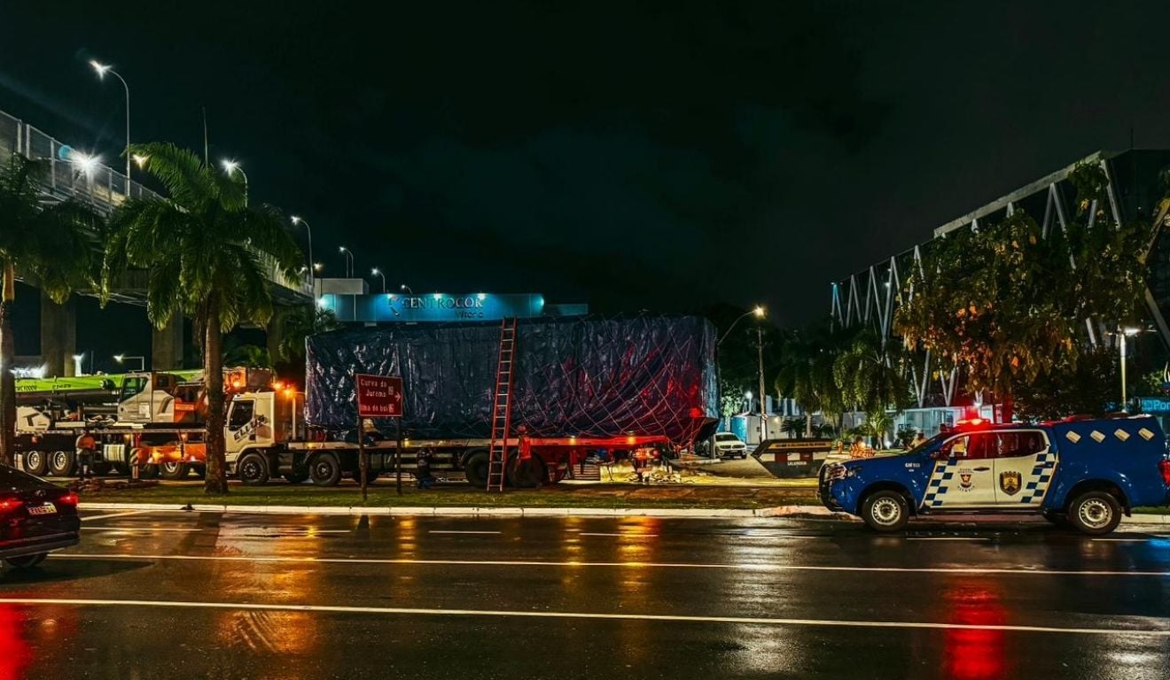 Imagens enviadas à reportagem do Folha Vitória mostram caminhões transportando partes da base na quinta-feira (12) nas proximidades da avenida em Vitória.