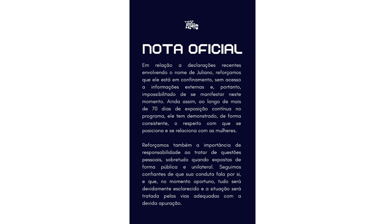 Segundo o comunicado, Juliano tem demonstrado, ao longo de mais de 70 dias de exposição no reality, uma postura respeitosa, especialmente em suas relações com mulheres. A equipe também reforçou a necessidade de responsabilidade ao tratar questões pessoais, principalmente quando expostas de forma unilateral.